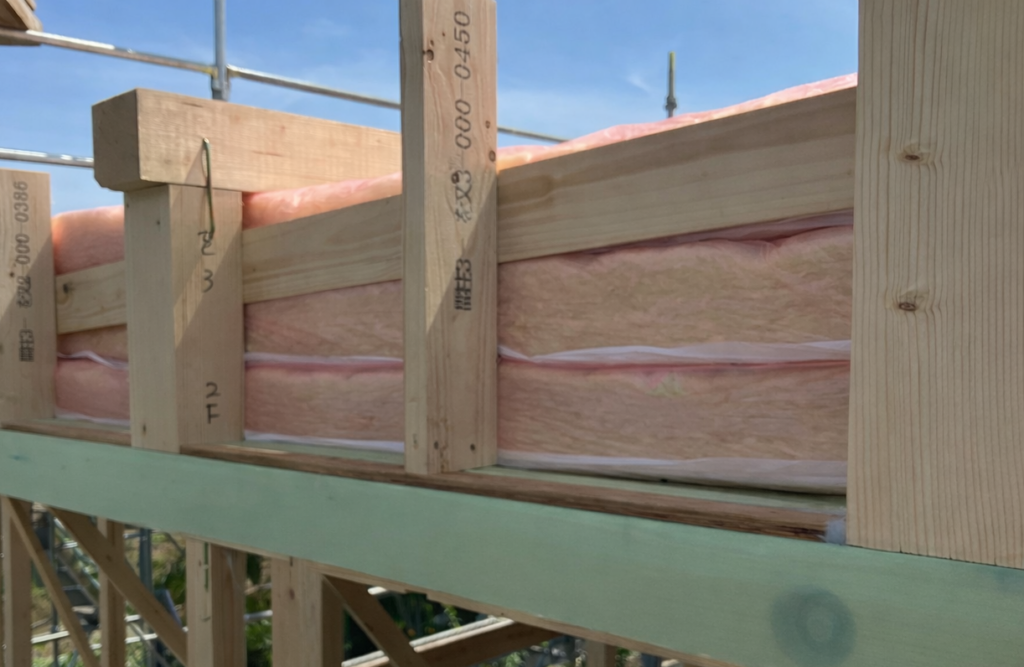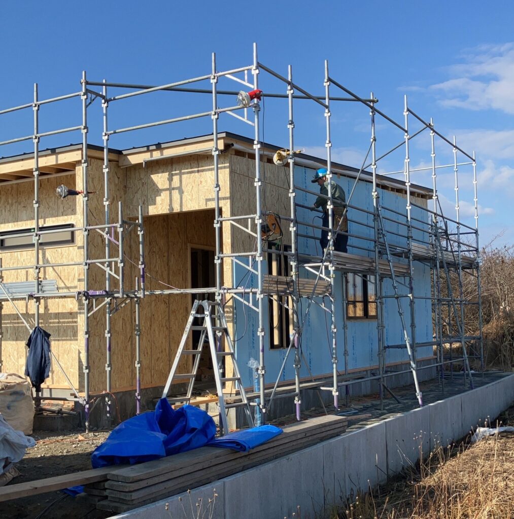建物の耐震性を高める壁構造用合板(OSB等)の貼り付けに加え、その外側から付加断熱材の施工を進めています。