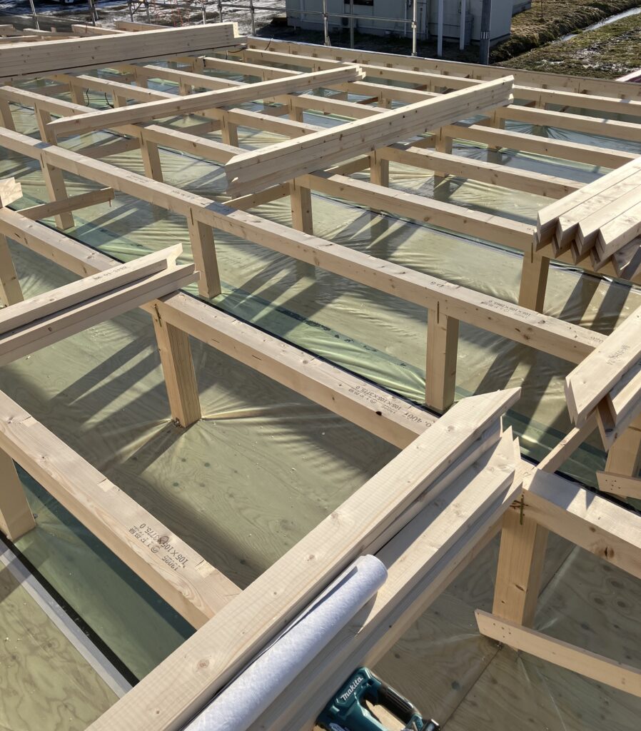 屋根を支えるための重要な骨組みである母屋の設置が完了しました。梁の上に一定の間隔で配置され、この後の屋根仕上げの土台となります。空が広く見えるこの段階は、建物の形が最もダイナミックに感じられる瞬間です。