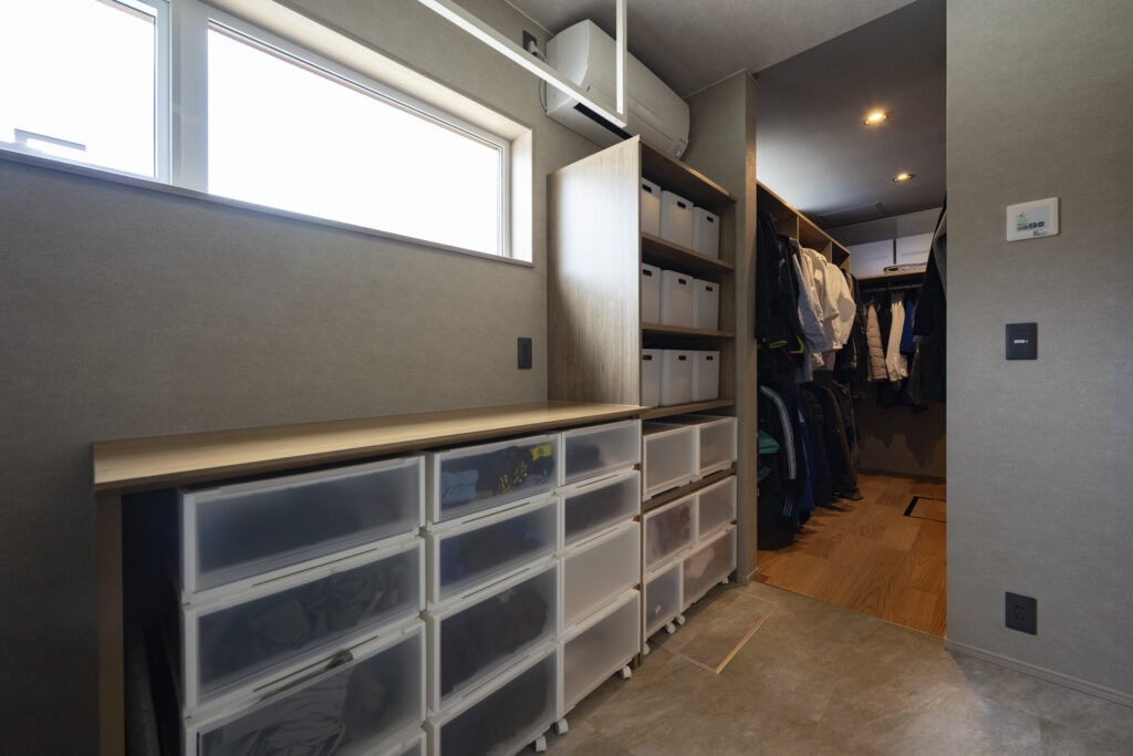 ランドリールームと接したファミリークローゼット。洗濯、乾燥、収納を1ヵ所に集約し、家事の負担を軽減した